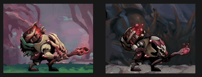 - The art for said enemies and platforms. We started out with some concepts and we already started working on some of the animations. In order to progress more quickly, we're taking advantage of opportunities to reuse animations for similar enemies. After all, other games like Blasphemous have enemy variations that only change color palettes. We started with reusing the "AimPew" (this is the name we've been using since it was just a PoC) animation to do the "Homing Pew" animation. As the name suggests, the difference is that the second one shoots homing projectiles instead of straight projectiles.