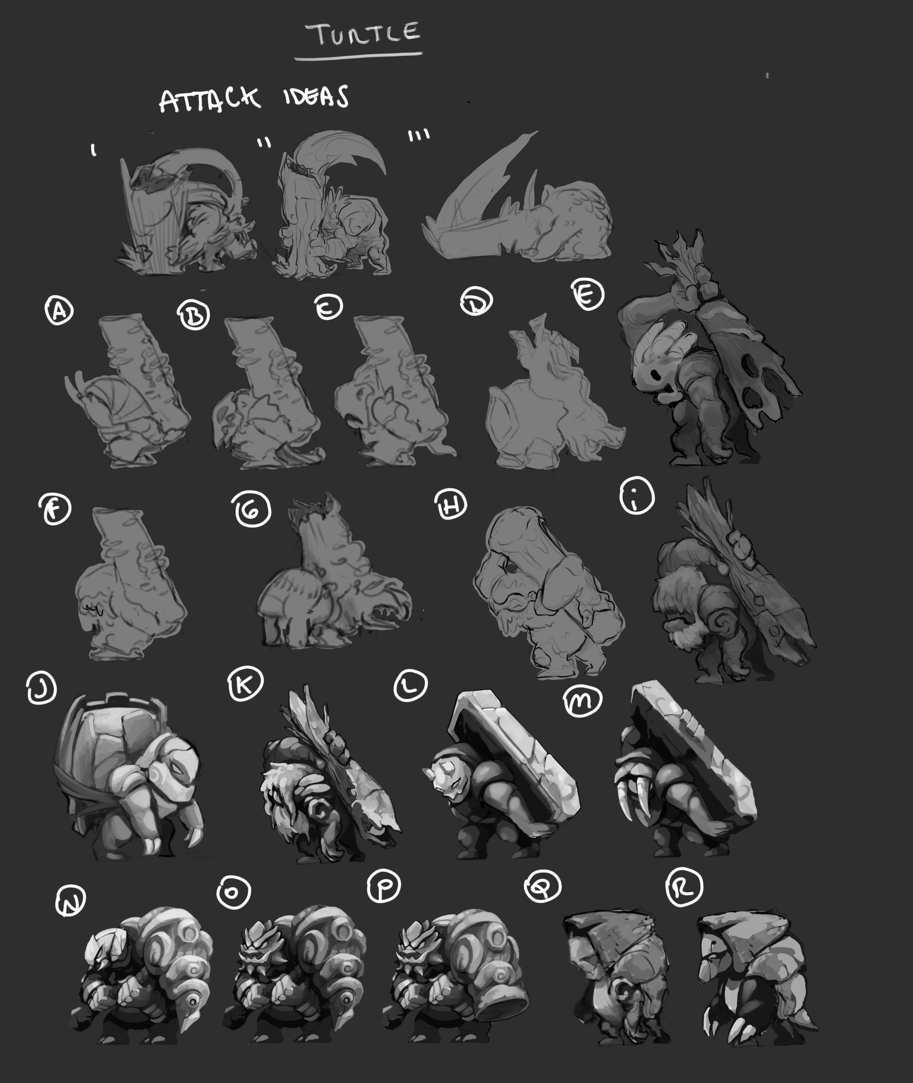 The art team worked based on the definition. As you can see, they provided a varied range of choices, with different weapons in which the Turtle can deal the damage, from slabs of stone to hammers to branches to even (as in Q and R) just very sharp nails. As you can see, the name "Turtle" is not meant to limit the art team to just draw turtles, it's an internal name that we use since the PoC stage, when we don't know how the enemy is going to look.