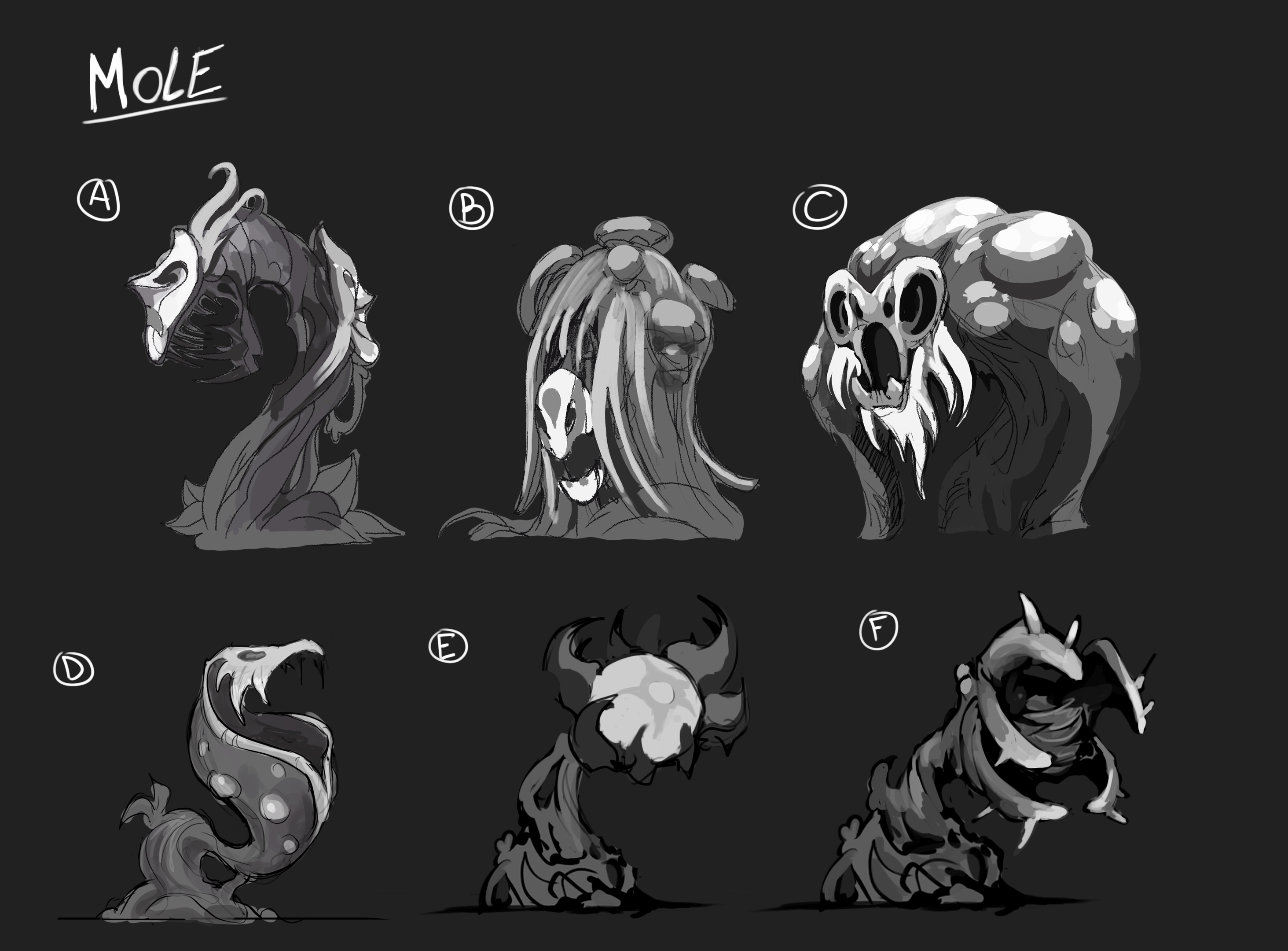 The "Attack ideas" at the top were useful to envision whether the design would work in the movement. We had another enemy on this batch (a "Mole" that moves underground and pops out of the ground to jump you) for which the concepts didn't show how the attack would look and it was something we decided we wanted to have for all future enemy concepts.