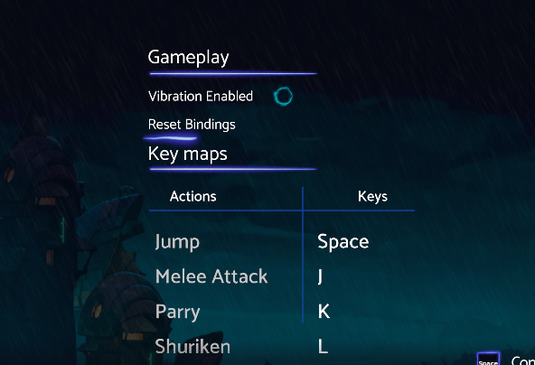 The biome we're currently working on is the Forest, in which Kenzu starts out with the skills of Shuriken (a throwable weapon), Slash, Slash combo, Parry, Wall jump and heal. By the end of this biome he will also obtain the Kunai, which will allow him to cling to enemies or special platforms.