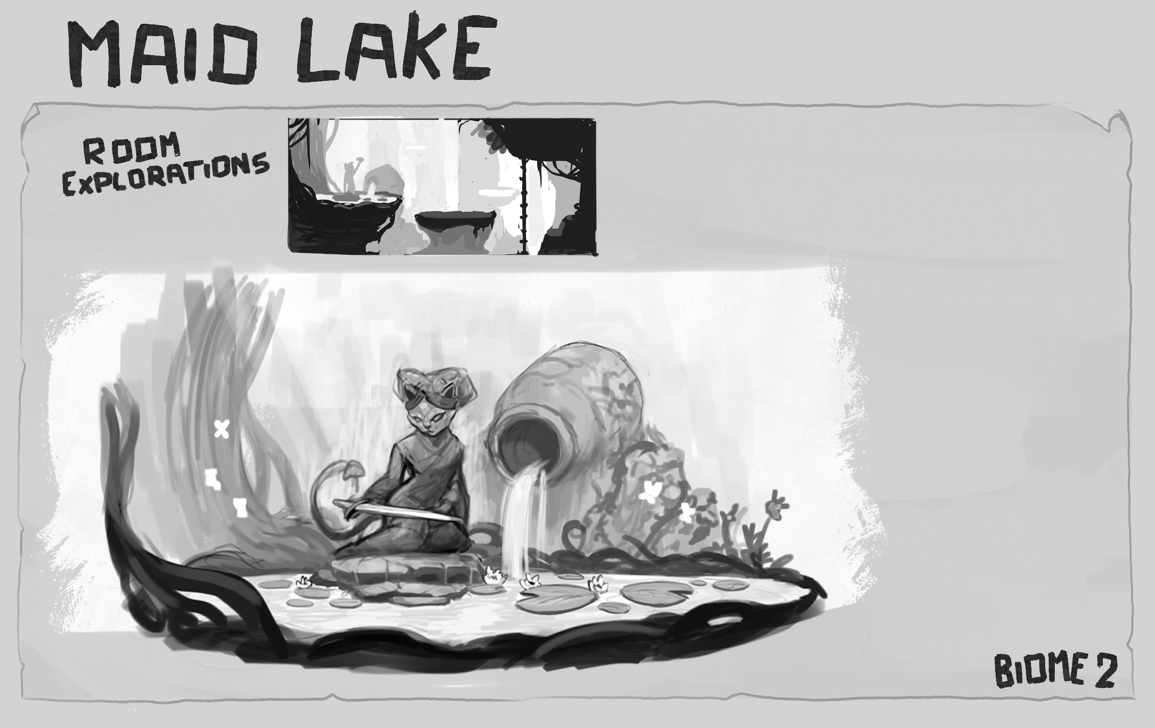 We had already completed a first general pass of the new biome, where we added very basic art, a general layout, and new platforms. But this week we added more rooms and elements related to the narrative that takes place in this new area. We moved from written text to integrating it into the project through boards, concepts, and testing.
